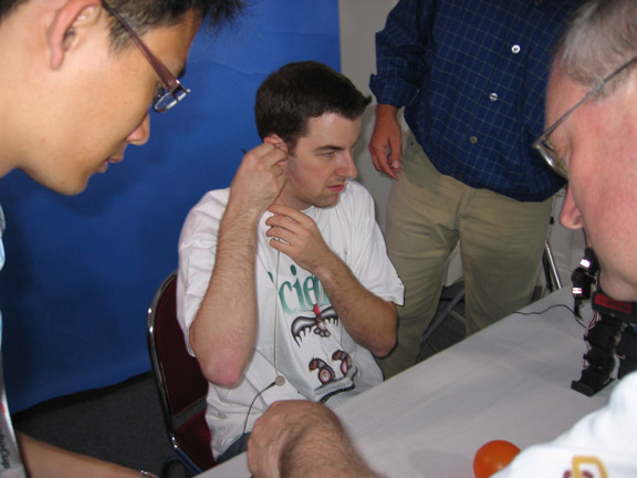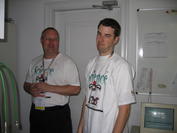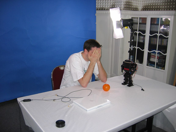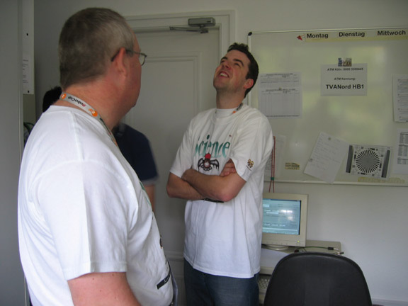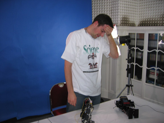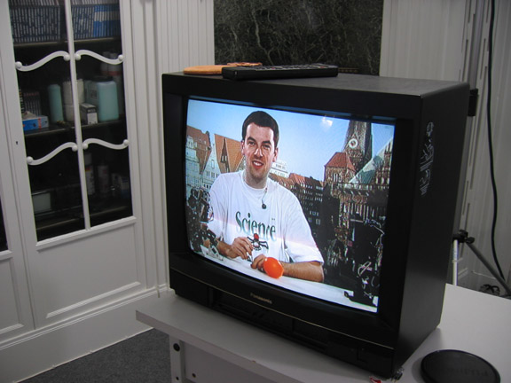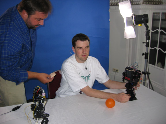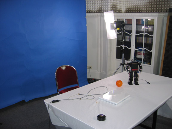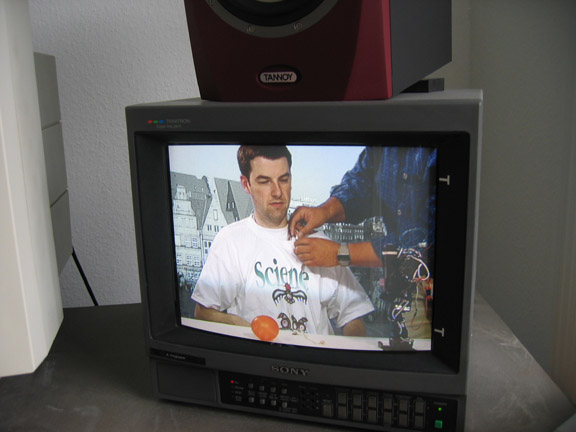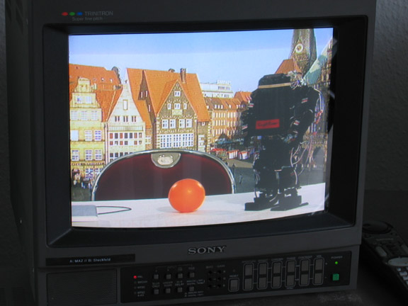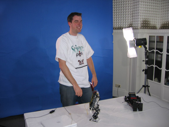While at RoboCup in Bremen, we were contacted by CTV's Canada AM to put in an appearance on the show. They hade a hard time arranging studio space in Bremen, because the World Cup and RoboCup events were taking up much of the local media pool. After a few days bouncing emails and phone calls back and forth, we managed to negotiate a time between events to go to a local studio to appear live. When we got there, they only had room for one person at the desk-in-front-of-the-blue screen, and Shane was elected.